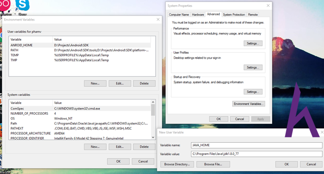 - Ở tab Advanced, chọn Environment Variables > New… (có 2 nút New, nút nào cũng được nhưng tốt nhất là dùng nút New… ở dưới) > nhập vào New user variable như hình với: --> Variable value là đường dẫn JDK như bôi đỏ đã ghi nhớ ở bước trước.