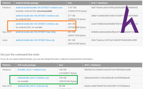- Màu cam: Bộ Android Studio lẻ / Màu xanh: Bộ Android SDK lẻ.