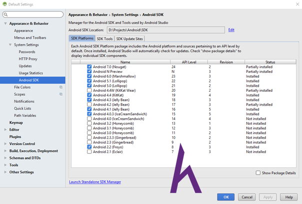 Và đi kèm với Android Studio là Android SDK. Nếu Android Studio là trình soạn thảo code (IDE) thì Android SDK là bộ tổng hợp các công cụ để build app, các bản mẫu máy ảo Android (sử dụng để test app) cần thiết để làm ra một ứng dụng Android hoàn chỉnh.