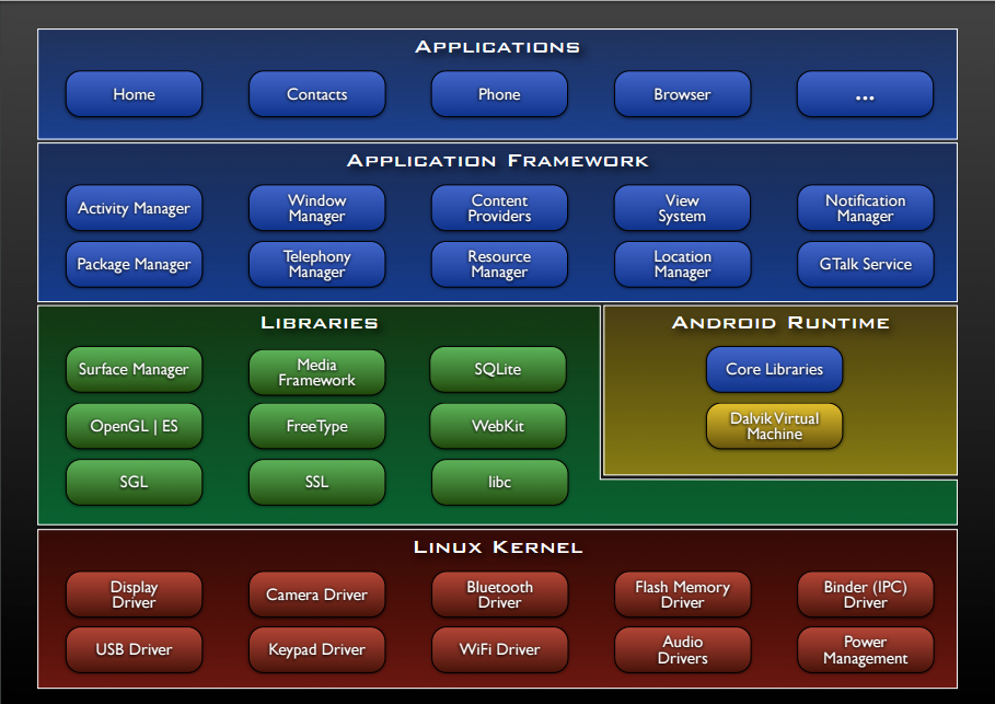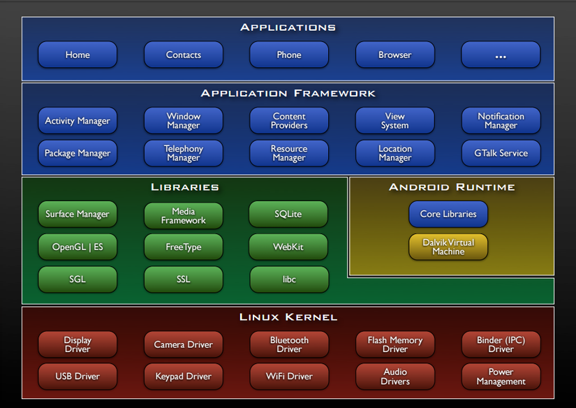 Về kiến trúc của hệ điều hành Android, chúng ta có thể xem qua sơ đồ sau: