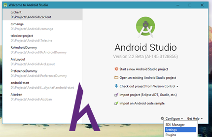 Nếu sau này trong quá trình sử dụng, hệ thống không tìm thấy đường dẫn đến Android SDK thì chúng ta có thể tinh chỉnh lại bất cứ khi nào bằng cách vào Configure > Settings: