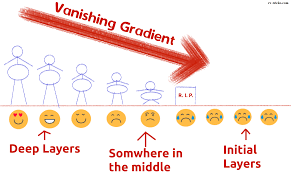 Tuy nhiên, trong thực tế Gradients thường sẽ có giá trị nhỏ dần khi đi xuống các layer thấp hơn. Dẫn đến kết quả là các cập nhật thực hiện bởi Gradients Descent không làm thay đổi nhiều weights của các layer đó và làm chúng không thể hội tụ và mạng sẽ không thu được kết quả tốt. Hiện tượng như vậy gọi là Vanishing Gradients.. Chỗ này hơi rối não