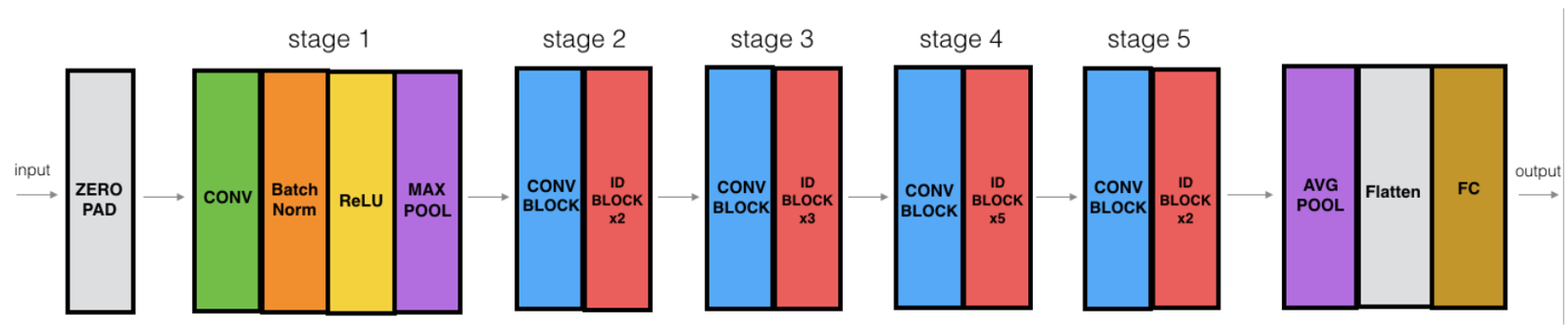 CONV2D -> BATCHNORM -> RELU -> MAXPOOL -> CONVBLOCK -> IDBLOCK*2 -> CONVBLOCK -> IDBLOCK*3