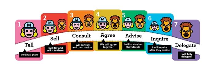 Tell: Quản lý nói cho thành viên của mình cách làm và yêu cầu họ làm theo.Sell: Quản lý gợi ý cách làm cho thành viên và nói cho họ lý do tại sao phải làm như vậy.Consult: Quản lý để thành viên đưa ra ý kiến về vấn đề nhưng vẫn là người quyết định cuối cùng.Agree: Cả quản lý và thành viên cùng thảo luận và ra quyết định, nếu có tranh chấp thì biểu quyết.Advise: Quản lý gợi ý cách làm nhưng thành viên sẽ là người quyết định.Inquire: Thành viên sẽ làm, chỉ cần báo cho quản lý biết mình sẽ làm như thế nào hoặc làm trước rồi báo kết quả sau.Delegate: Thành viên có thể chủ động làm việc theo cách của mình và có thể không cần báo cáo lại với quản lý.