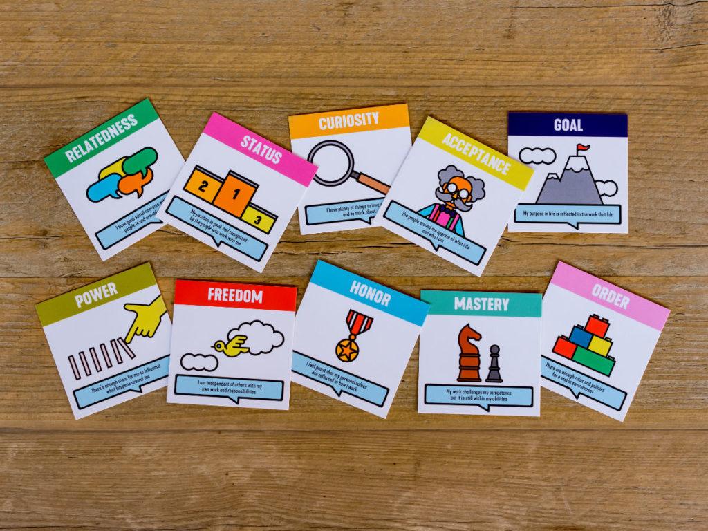 Curiosity: sự học hỏi, trau dồi kĩ năngAcceptance: được mọi người chấp nhậnPower: được tiếp xúc với mọi lĩnh vấn đề trong công việcRelatedness: có quan hệ tốt với đồng nghiệpGoal: hoàn thành được mục tiêu cuộc sốngHonor: được vinh danh, ghi nhậnMastery: có trình độ chuyên môn về một lĩnh vực nào đóFreedom: được tự do thoải mái khi làm việcOrder: làm việc trong môi trường ổn địnhStatus: đang làm việc ở vị trí tốt