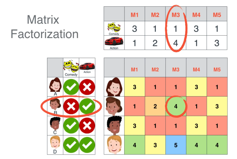 Chúng ta có 4 người, với 2 thể loại phim là "comedy" và "action", ma trận X tương đương với ma trận lớn, các con số là số điểm rating bộ phim) ma trận "trái" "trên" tương đương với các ma trận cần tìm (phân tách).