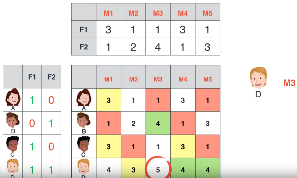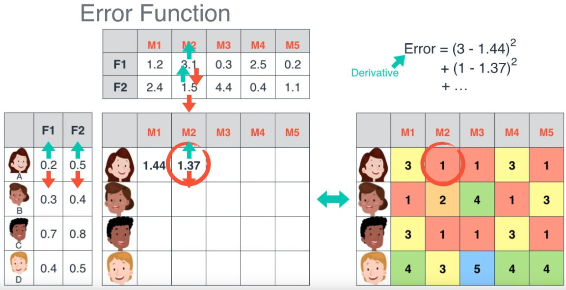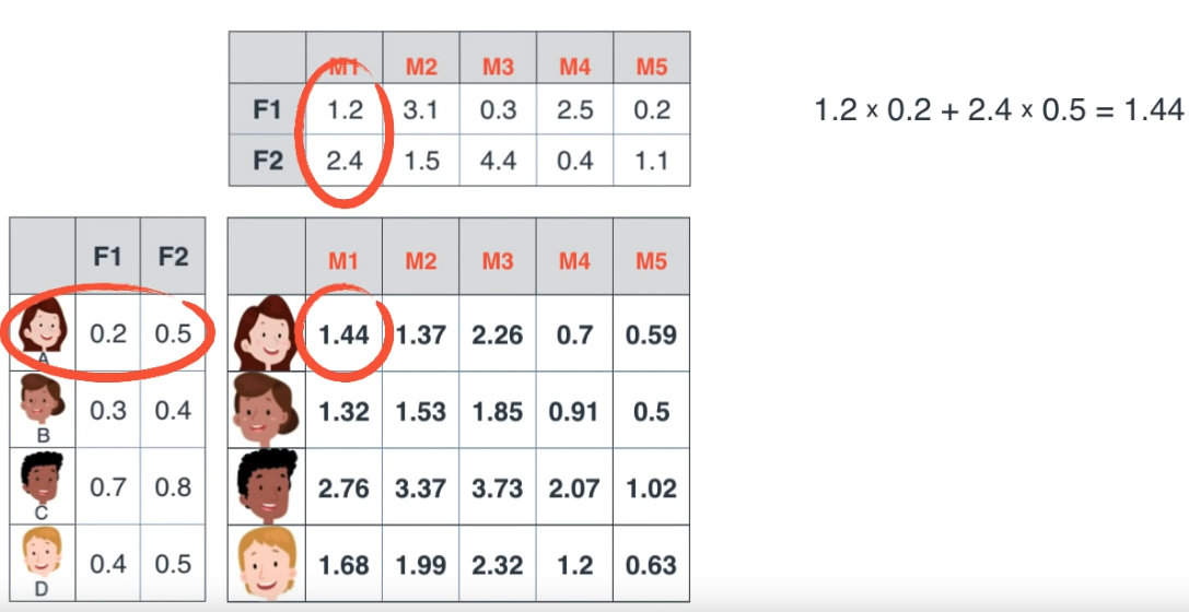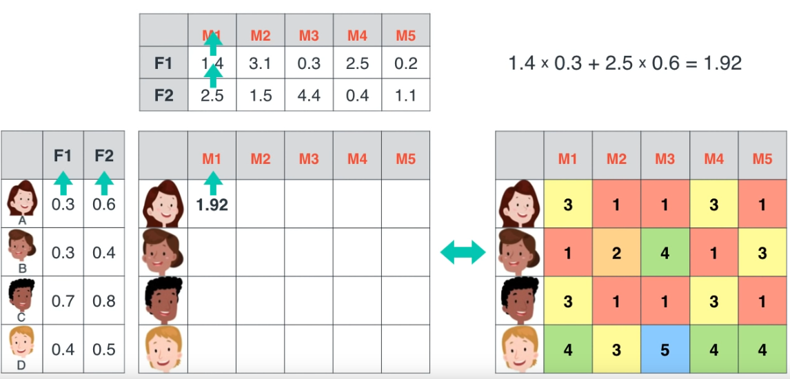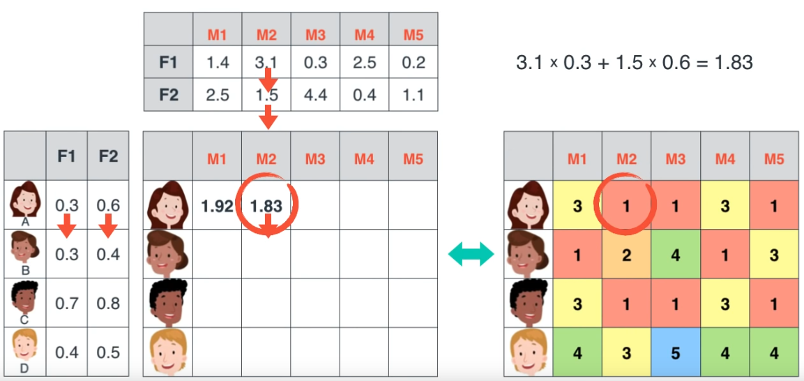 Sau khi tìm được 2 ma trận tương ứng, chúng ta có thể dự đoán được những điểm dữ liệu bị thiếu dựa vào việc nhân ma trận (vì dữ liệu thực tế thường không đầy đủ, rời rạc, chúng ta có thể filling các giá trị giả định, sau khi tìm được các ma trận phù hơp, chúng ta có thể quay lại dùng phép nhân ma trận để dự đoán các dữ liệu bị thiếu).