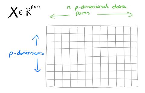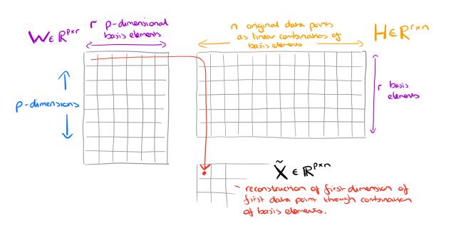Như trên, chúng ta có một ma trận dữ liệu X (p x n), mục đích của NMF là giảm chiều dữ liệu từ p xuống r thông qua việc tìm 2 ma trận con có phép nhân ~= X Để làm được vậy chúng ta thông qua việc
