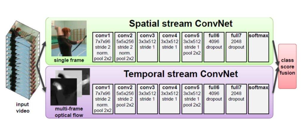 Ý tưởng là mô hình chia thành 2 luồng: luồng trên đầu vào là một ảnh (frame), đi qua CNN, luồng dưới đầu vào là list các frame liền kề được merge bằng fusion technique, biểu diễn chuyển động của các điểm của người (multi-frame optical flow), đi qua CNN. Kết quả cuối cùng là trung bình cộng của 2 predicted score.