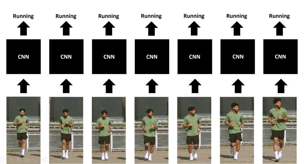 Ngày nay, thay vì gắn thêm sensor vào người thì các nhà nghiên cứu ứng dụng Computer Vision để nhận diện hành động của người. Ban đầu họ cũng thử Image Classification nhưng lại toang như hình dưới.