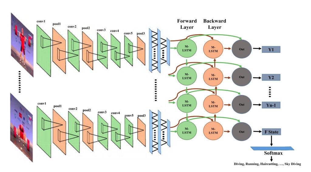 Ý tưởng là cho từng frame đi qua CNN để trích xuất local features. Sau đó đi qua LSTM để học mối quan hệ giữa các features này. Để hiểu sâu thêm thì mời bạn đọc paper này "Action Recognition in Video Sequences using Deep Bi-Directional LSTM With CNN Features " (https://ieeexplore.ieee.org/abstract/document/8121994).