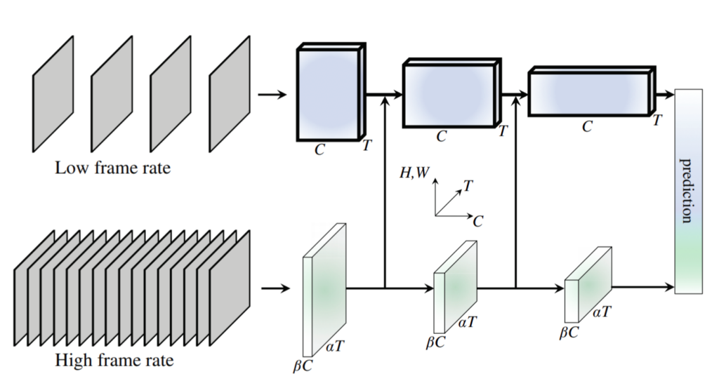 Mình chưa đọc qua nên cũng không có hiểu sâu mạng này cho lắm. Nhìn sơ qua thì mô hình cũng chia làm 2 luồng như cách trên, luồng trên (Slow pathway) đầu vào là low frame rate (tức là cái video cứ giật giật ý, FPS thấp), đi qua các layer, mỗi layer lại có nhiều channel để xử lý chi tiết từng frame. Còn luồng dưới (Fast pathway) đầu vào là high frame rate (FPS cao), các frame liền kề không có quá nhiều thay đổi nên đi qua các layer có ít channel hơn (trong paper họ nhân với hệ số beta = 1/8 channel) => luồng dưới nhẹ hơn luồng trên. Theo trong hình thì ở đây có 3 giai đoạn, thông tin trích xuất ở đường dưới sẽ merge với đường trên ở mỗi giai đoạn.