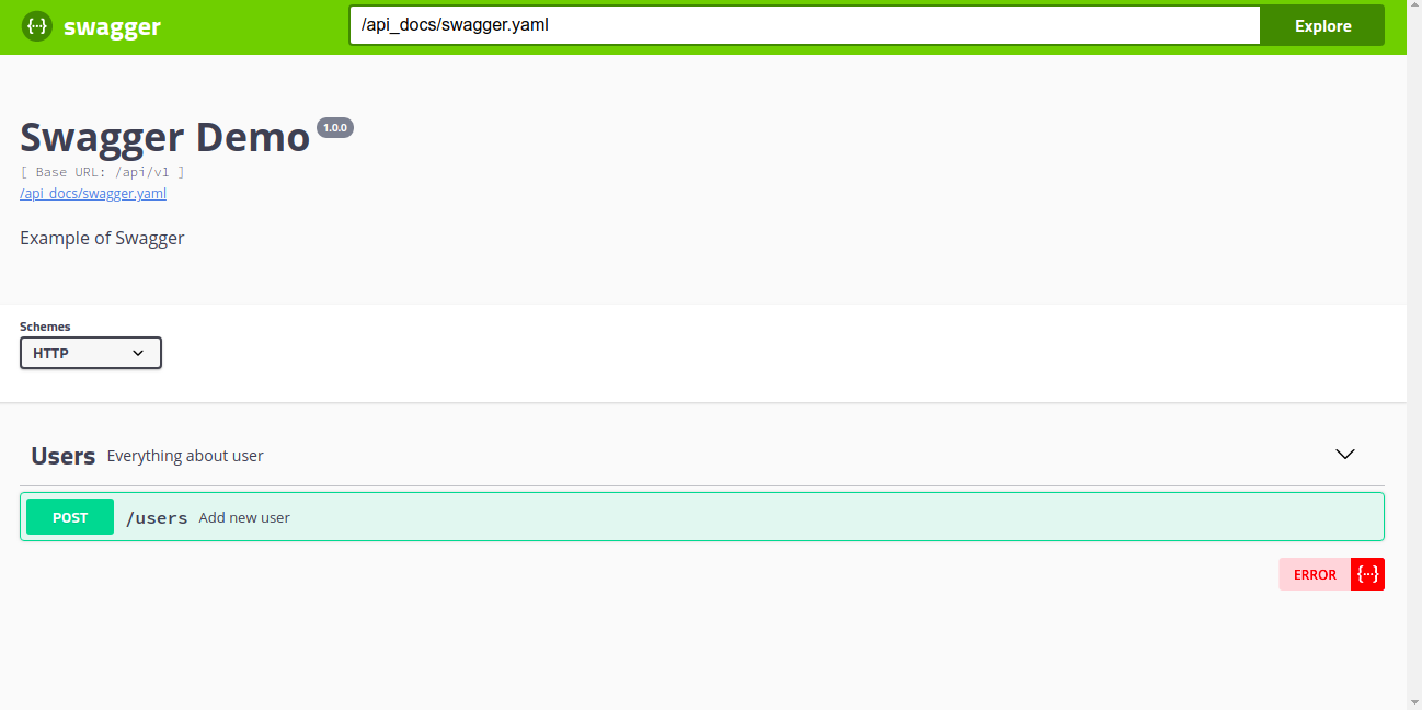 - paths: đường dẫn đến API, trong ví dụ này /users tức là URL của API này sẽ là /api/v1/users vì bạn đã khai báo basePath ở trên nên có thể lược bỏ phần base