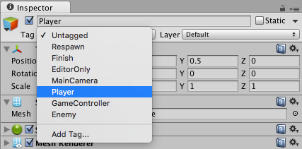 Player game object chưa được gắn thẻ - bạn sẽ làm điều đó ngay bây giờ. Chọn đối tượng Player từ Hierarchy và sau đó trong Inspector tab, chọn Player từ dropdown menu của Tag: