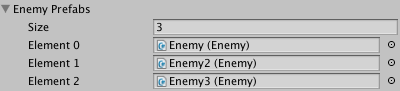 Enemy Prefabs: Size: 3 Element 0: Enemy Element 1: Enemy2 Element 2: Enemy3