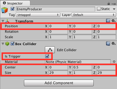 2.Box Collider: Is Trigger: true Center: (0, 0.5, 0) Size: (29, 1, 29)