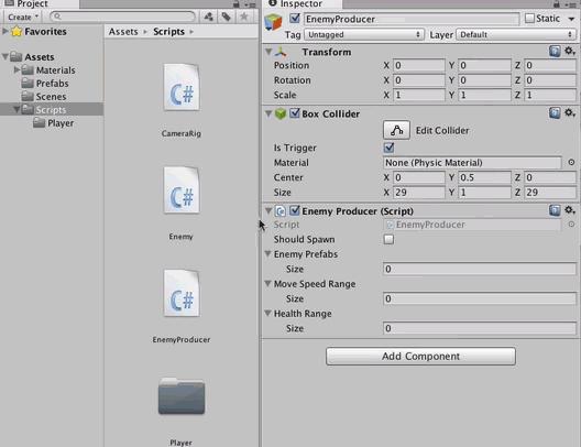 Tạo một tập lệnh mới có tên EnemyProducer và đính kèm nó vào GameObject của EnemyProducer. Trong class mới được thiết lập, thêm các thành phần sau: