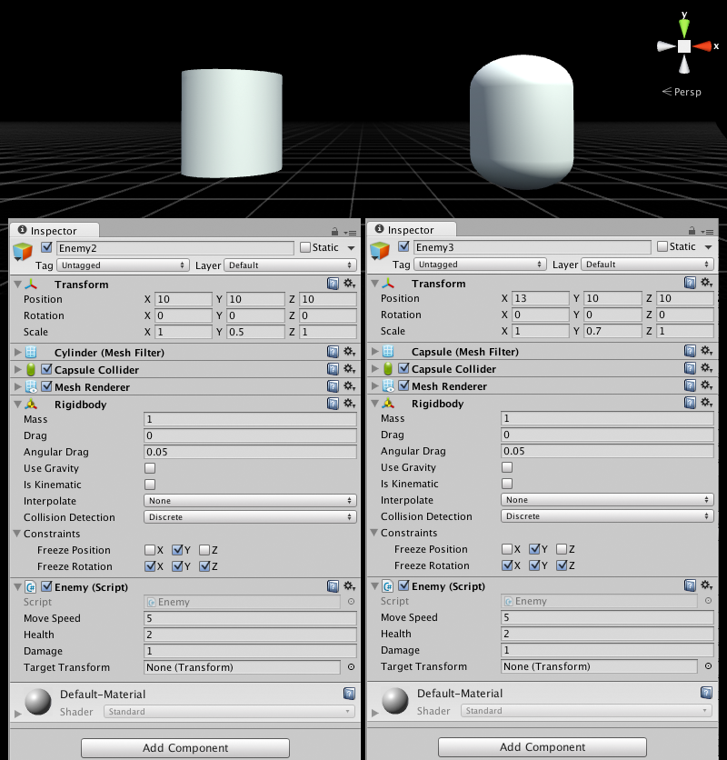 Tạo một 3D Cylinder và Capsule trong Scene. Đặt tên chúng lần lượt là Enemy2 và Enemy3. Giống như bạn đã làm trước đó với kẻ thù đầu tiên, hãy thêm một thành phần Rigidbody và script Enemy cho cả hai. Chọn Enemy2 và thay đổi cấu hình của nó trong Inspector như sau: