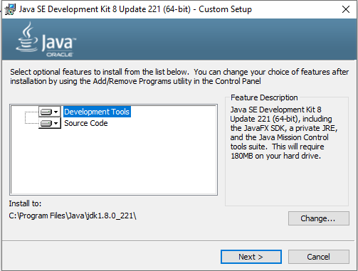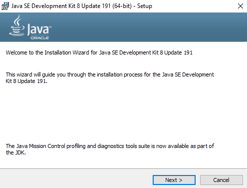 Trước khi nhấn Next hãy nhớ đường dẫn cài đặt JDK (như trong hình dưới là ở C:\Program Files\Java\jdk1.8.0_191) để cấu hình Java.