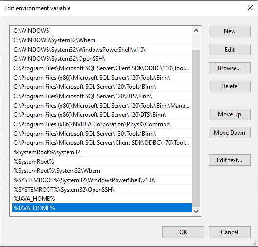 Các bạn tìm biến path trong System variables và nhấn vào edit, cửa sổ Edit environment variable hiện ra, tiếp theo chọn New nhập tên biến %JAVA_HOME% và nhấn OK