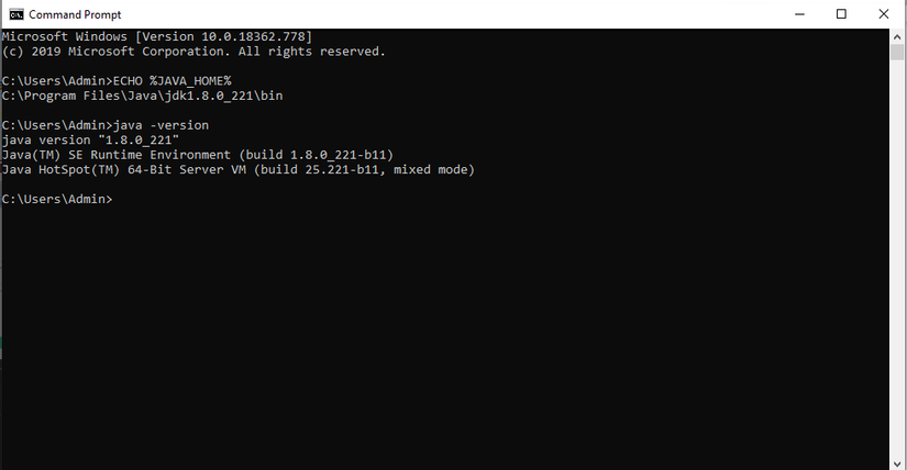 Đầu tiên mở CMD, sau đó nhập lệnh ECHO %JAVA_HOME%