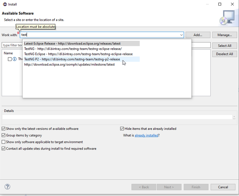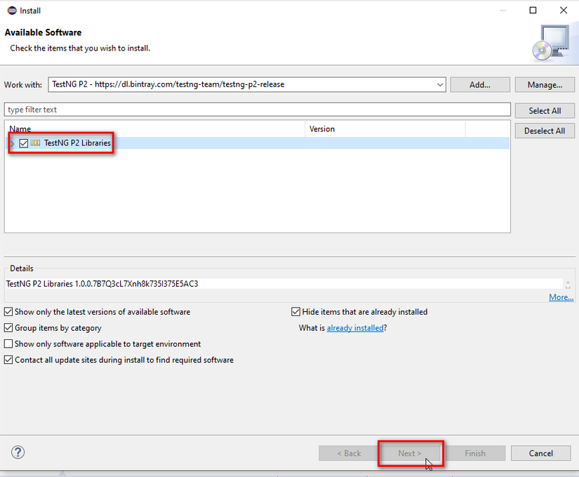 Tại trường Work with, có thể nhập "TestNG", hệ thống sẽ xuất hiện gợi ý cho bạn chọn. Lúc này hãy chọn "TestNG P2" (Đây là bản được cập nhật gần đây nhất, tương thích với Eclipse 2020)