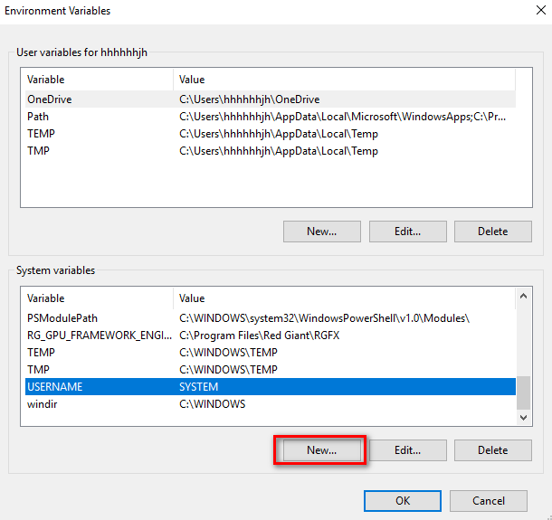 Tiếp theo nhấn vào New cửa sổ new system variable hiện ra, điền Variable name vào.
