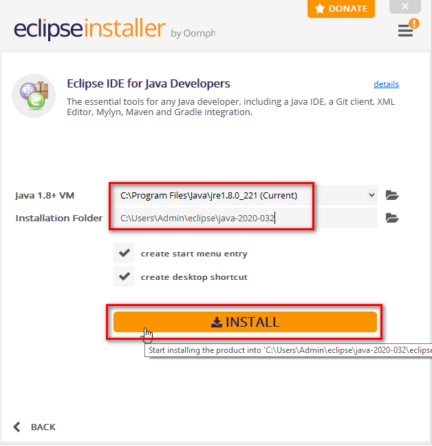 Cửa sổ cài đặt sẽ hiện ra. Eclipse sẽ tự động chọn JRE (có sẵn khi cài đặt JDK) và folder, bạn cũng có thể tự tùy chỉnh theo ý muốn. Sau đó click Install và chờ