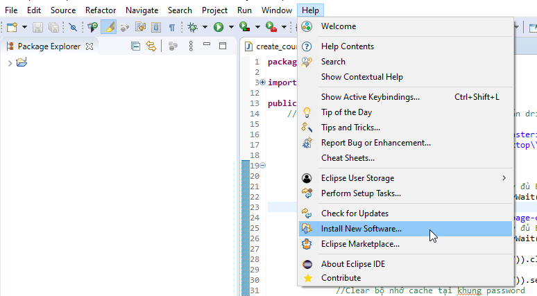 Mở Eclipse IDE. Chọn Help > Install new software => Trên màn hình sẽ hiển thị một cửa sổ có tên Install