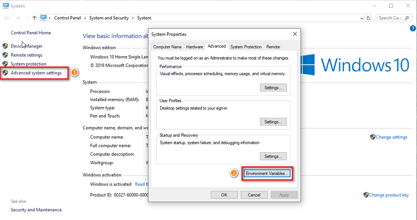 Tại màn hình "System" chọn "Advanced system settings", tiếp đến chọn thẻ Advanced => Environment Variables