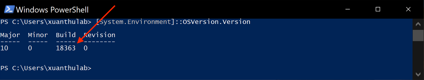 Đảm bảo hệ thống của bạn là Windows 10 (64 bit, version 1607) trở đi hoặc Windows Server 2019, kiểm tra bằng lệnh trong PowerShell (PS):