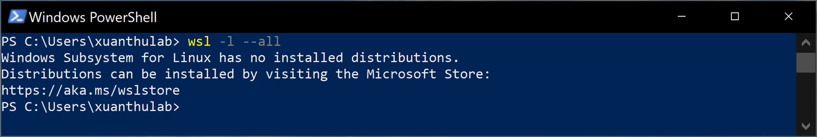Thời điểm này, chưa có bản linux nào cài đặt, đăng ký - nên thông báo như trên, nó yêu cầu bạn truy cập vào Microsoft Store theo đường dẫn https://aka.ms/wslstore, để tìm và tải về Distro Linux muốn cài