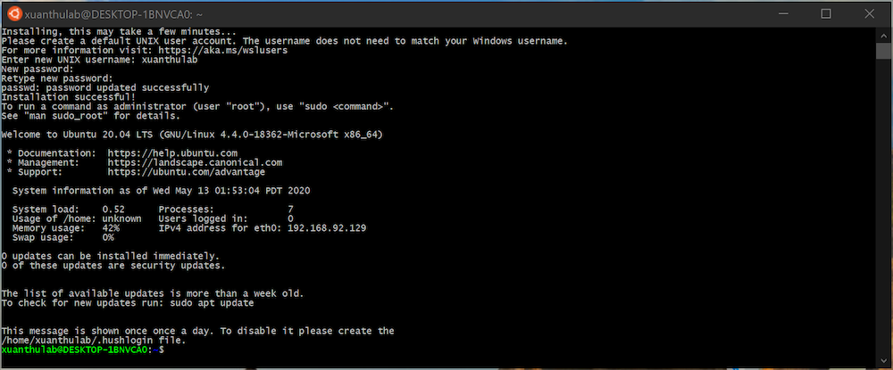 Bạn đã bắt đầu chạy Ubuntu trong Windows, đang ở dòng lệnh của Ubuntu, từ sau mỗi khi chạy Ubuntu từ menu Start bạn sẽ được vào thẳng dòng lệnh này. Giờ thì đã bắt đầu có thể thực hiện các lệnh Linux Ubuntu trên Windows.