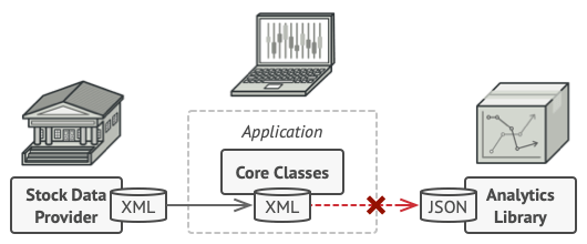 Hãy tưởng tượng rằng bạn đang tạo một ứng dụng theo dõi thị trường chứng khoán. Ứng dụng tải dữ liệu chứng khoán từ nhiều nguồn ở định dạng XML và sau đó hiển thị các sơ đồ bảng biểu ra cho người dùng. Tại một thời điểm nào đấy, bạn quyết định cải thiện ứng dụng bằng cách tích hợp thư viện phân tích thông minh từ bên thứ 3. Nhưng có một vấn đề: Thư viện này chỉ hoạt động với dữ liệu ở định dạng JSON.