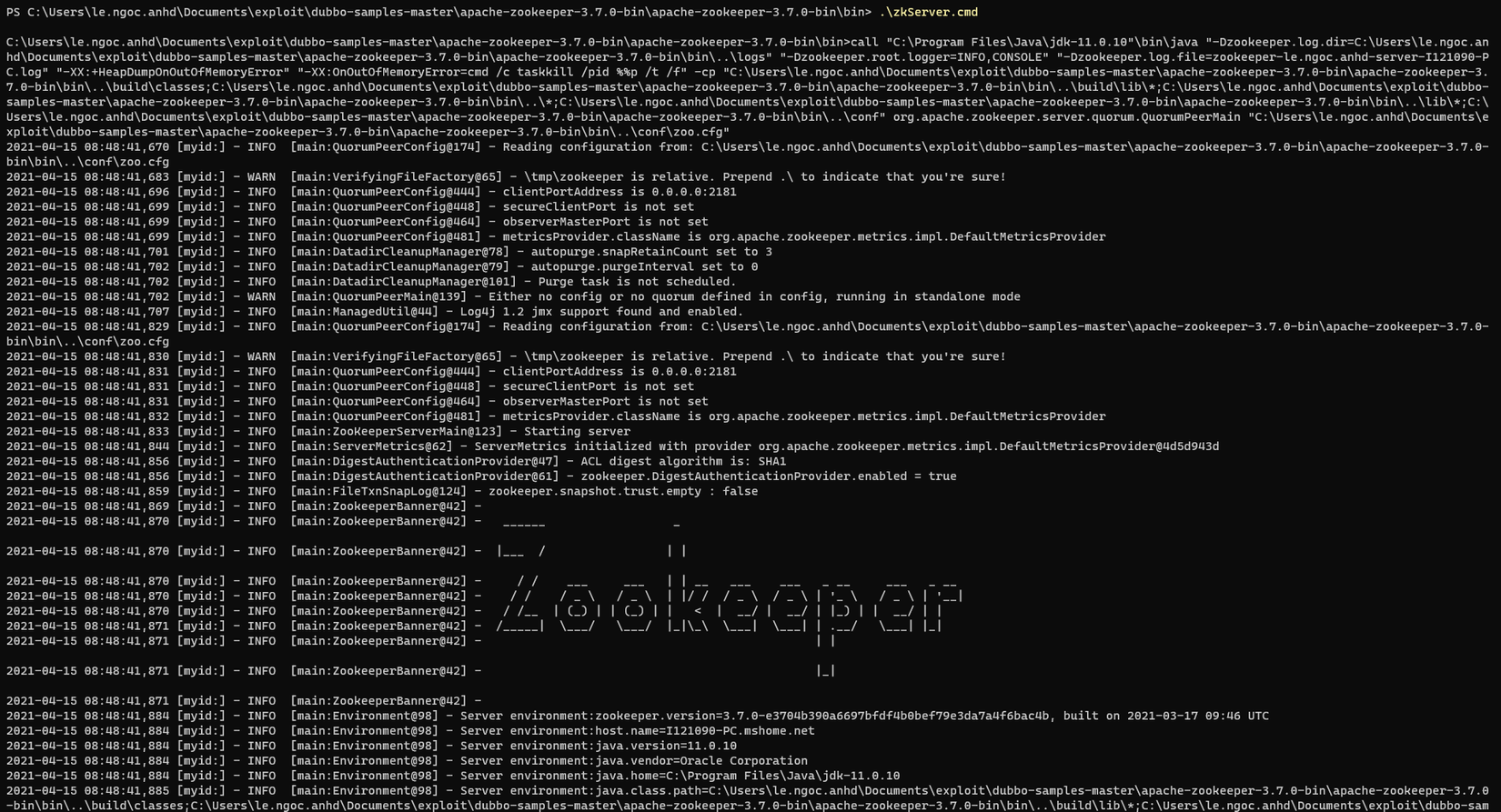 Sau khi tải zookeeper về các bạn khởi chạy nó lên zkServer.bat. Lưu ý là trước khi chạy các bạn tạo 1 file zoo.cfg trong thư mục conf với nội dung copy từ file zoo_sample.cfg: