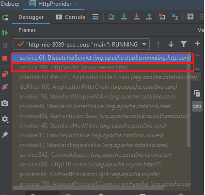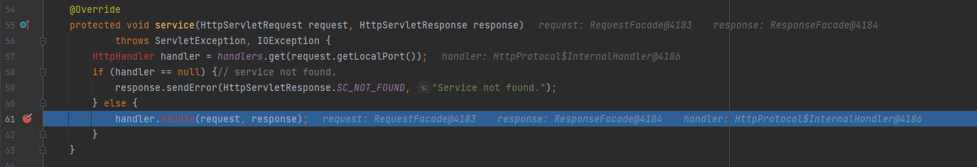 Request này sẽ đi qua method org.apache.dubbo.remoting.http.servlet.DispatcherServlet.service do lớp DispatcherServlet kế thừa lớp javax.servlet.http.HttpServlet là nơi xử lý toàn bộ các request http được gửi tới server. Đặt breakpoint tại dòng 43.