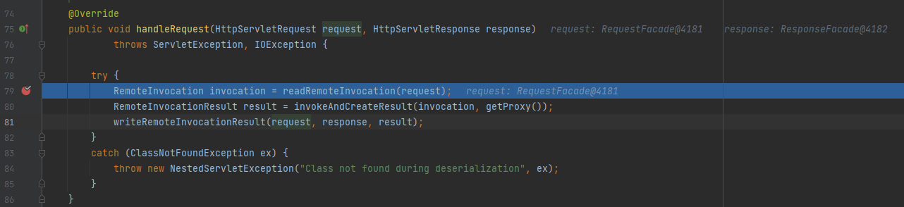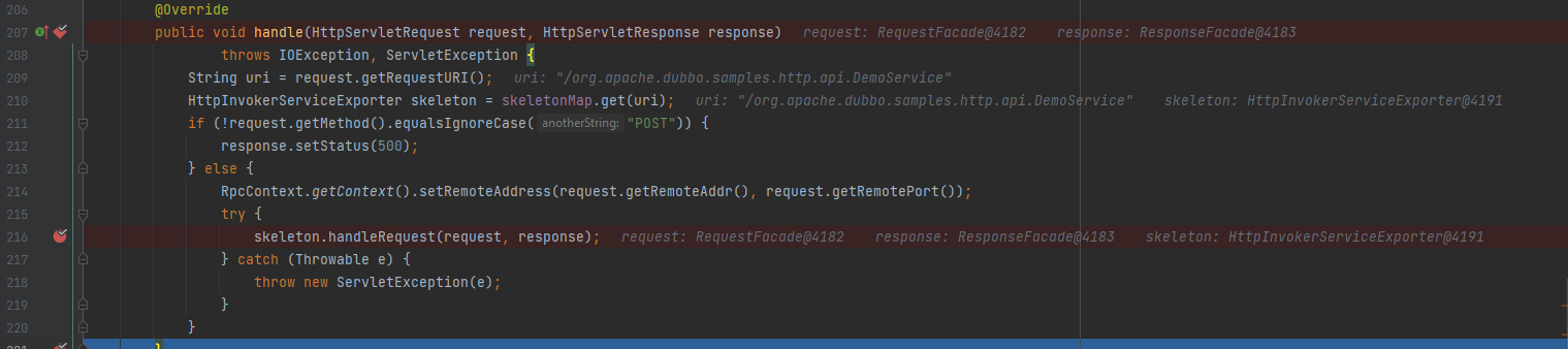 Sau khi lặp lại các bước trên chúng ta đặt breakpoint tại dòng 216 và bấm F7 để nhảy tới method xử lý tiếp theo là org.springframework.remoting.httpinvoker.HttpInvokerServiceExporter.handleRequest