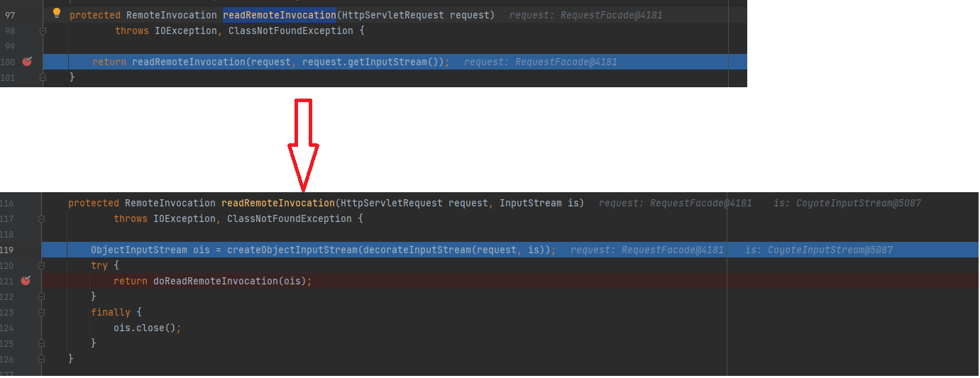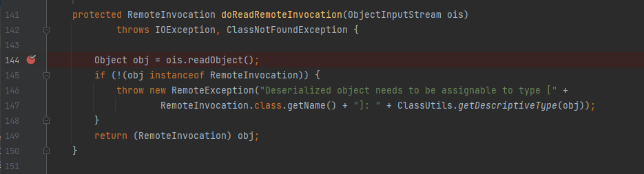 Đến đây thì đối với một số người đã nghiên cứu về java deserialization ở đây sẽ nhận ra ngay vấn đề đã nằm ở chỗ này rồi. Đó là đọc 1 stream bất kì mà người dùng nhập vào trong POSTrequest. Chú ý ở dòng 119 chương trình đã tạo lại ObjectInputStream từ stream chúng ta gửi lên và truyền vào method doReadRemoteInvocation. Nhảy vào method này để đọc tiếp.