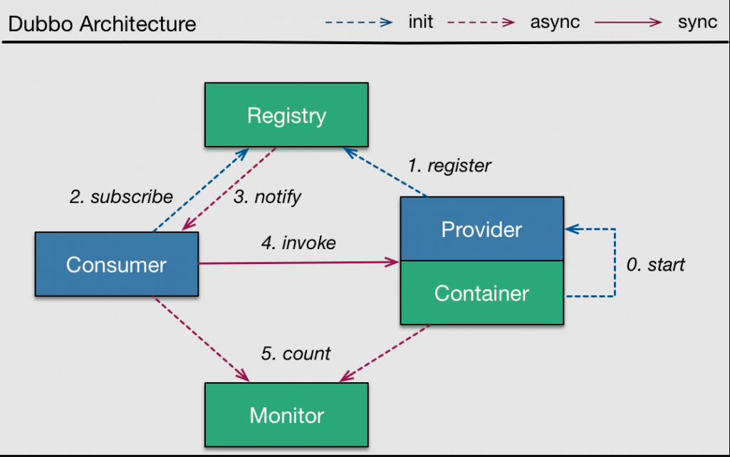 Hoạt động của kiến trúc dubbo được mô tả như sau: