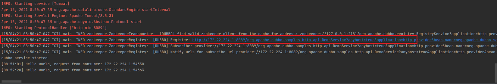 Khỏi chạy lớp HttpProvider. Nhận thấy provider đã đăng kí 1 dịch vụ với zookeeper http://172.22.224.1:8089/org.apache.dubbo.samples.http.api.DemoService?anyhost=true&application=http-provider&bean.name=org.apache.dubbo.samples.http.api.DemoService&deprecated=false&dubbo=2.0.2&dynamic=true&generic=false&interface=org.apache.dubbo.samples.http.api.DemoService&methods=sayHello&pid=8700®ister=true&release=2.7.3&server=tomcat&side=provider×tamp=1618451446458.