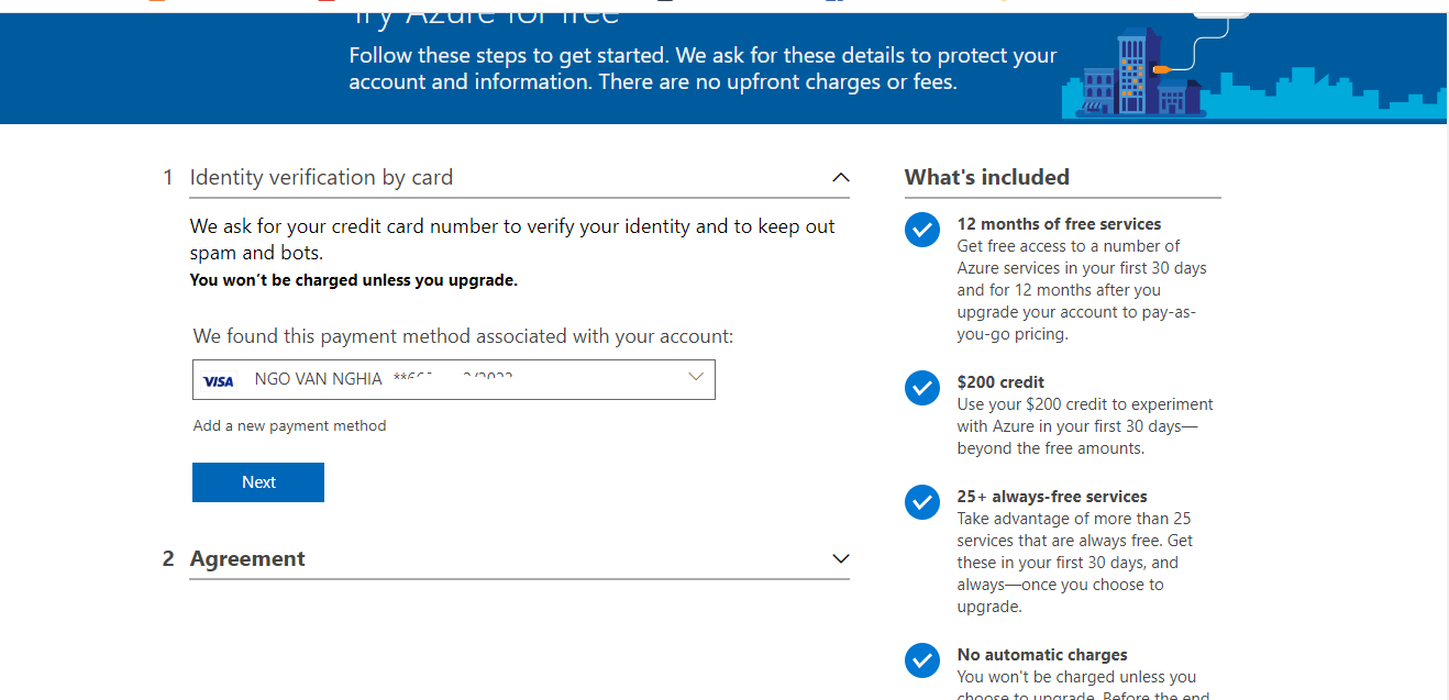 Trước khi có thể tạo được member bạn cần có một tài khoản microsoft và cần phải xác minh thẻ thanh toán để có thể sử dụng free 12 tháng và có 200$ để sử dụng dịch vụ trong 30 ngày. Nó sẽ yêu cầu thẻ Visa hoặc mastercard: tại đây