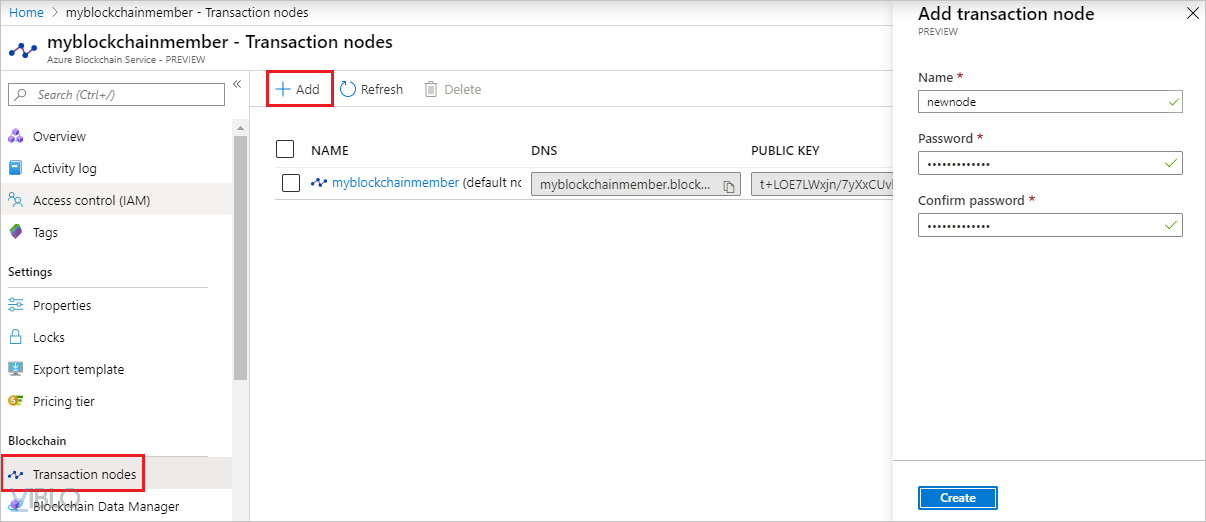 - Ở trong Azure portal ta sẽ chuyển hướng đến Azure Blockchain Service member và chọn Transaction nodes > Add.