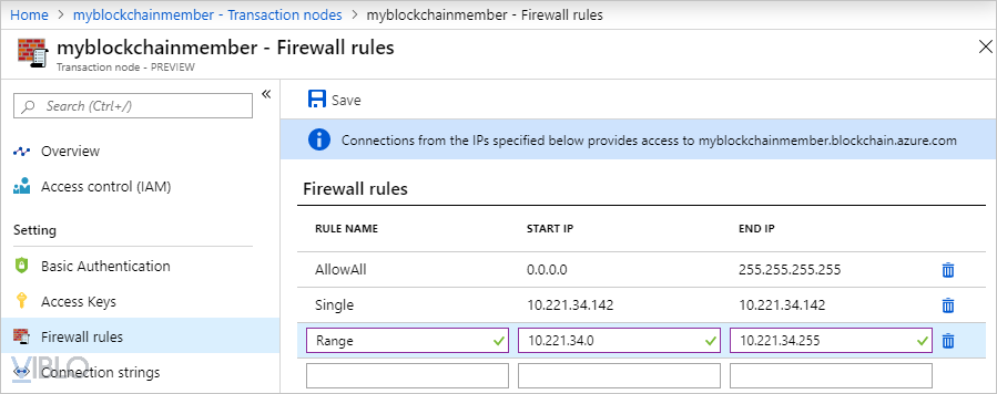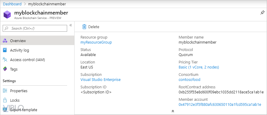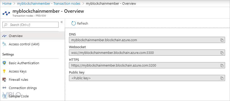 - Trong Azure portal ta chuyển đến một transaction nodes của Azure Blockchain Service member và chọn Overview