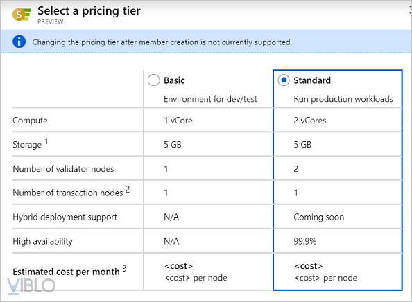 Nhà phát hành thì khuyên nên sử dụng loại basic cho các môi trường như dev hoặc test. Còn muốn sử dụng cho môi trường production thì loại standard sẽ phù hợp hơn. vì loại basic thì compute chỉ có 1 vCore, trong khi loại standard sẽ có 2 vCores nên 1 vCore có thể sử dụng cho transaction node với validator node và 1 vCore còn lại có thể sử dụng cho các dịch vụ liên quan đến cơ sở hạ tầng khác.