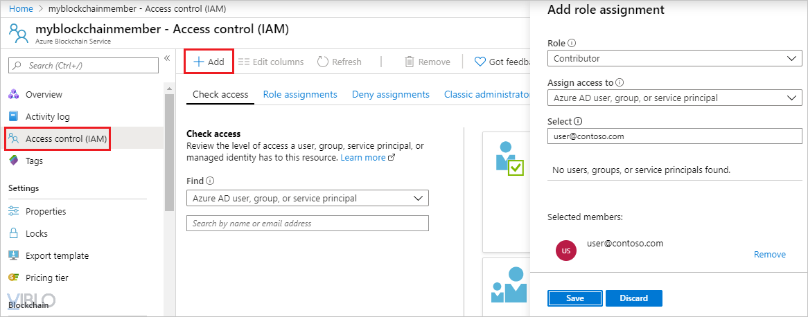 - Tại Azure portal chuyến trang đến Azure Blockchain Service member của bạn và chọn Transaction nodes > Access control (IAM) > Add > Add role assignment.