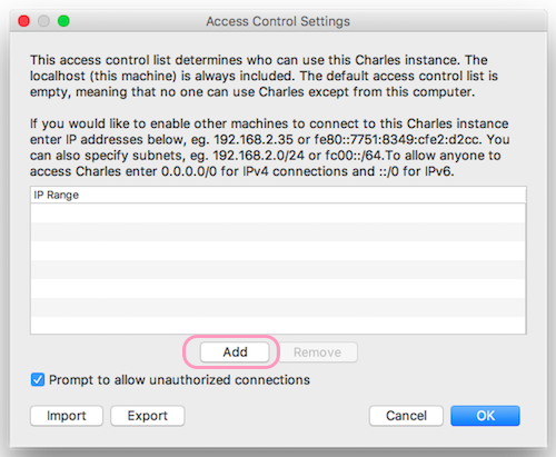 Tiếp tục, config access control cho máy mac như sau: Vào Proxy > Access Control Settings… để cho phép các device được phép kết nối với Charles bằng cách thêm mới.