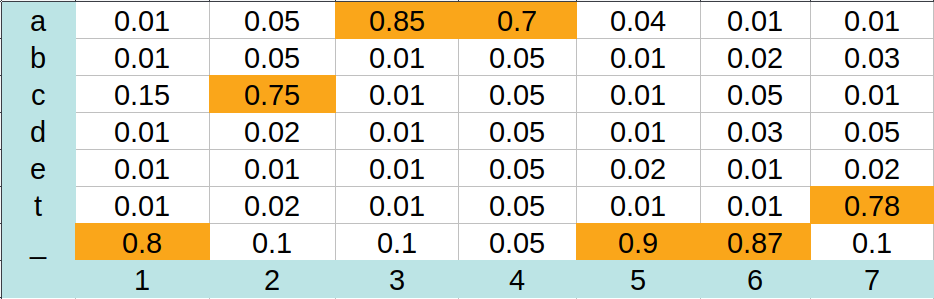 Những con số nền vàng là xác suất cao nhất trong mỗi time-step. Với giải thuật này thì ta sẽ chọn được chuỗi các ký tự là: "_caa__t", sau đó ta loại bỏ đi các ký tự trùng nhau và ký tự trống để cho ra chuỗi hoàn chỉnh là: "cat".