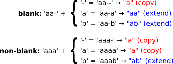 Khi ta mở rộng một path (mở rộng một beam) thì ta có ba cách: mở rộng bằng ký tự trống, bằng ký tự giống ký tự cuối và bằng một ký tự khác ngoài hai cái trên. Do đó ta sẽ có hai trường hợp là copy và extend như hình dưới đây: