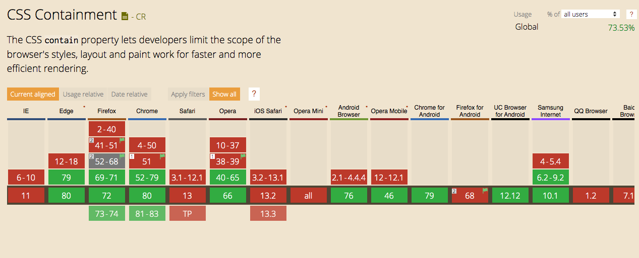 Trước khi kết thúc, có một điều mà các bạn cần phải lưu ý đó chính là Browser support - trình duyệt hỗ trợ. Containment specification giờ đã trở thành một trong những W3C Recommendation - đo lường web tiêu chuẩn. Và một điều nữa là người dùng hoàn toàn không thấy sự khác biệt khi có và không có thuộc tính này. Nên dù trình duyệt có hỗ trợ hay không thì người dùng vẫn sẽ có trải nghiệm bình thường ở mặt hiển thiện, có khác biệt thì chỉ là khác biệt hiệu năng mà thôi.